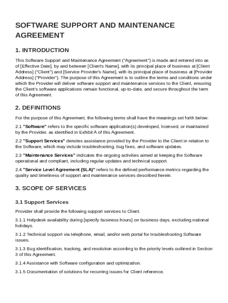 A Software Support and Maintenance Agreement is a formal contract between a software provider and a client, ensuring that support and maintenance services are clearly outlined and understood. This agreement typically includes details on the level of software maintenance services, technical support, and responsibilities of both parties, which can greatly affect software performance.