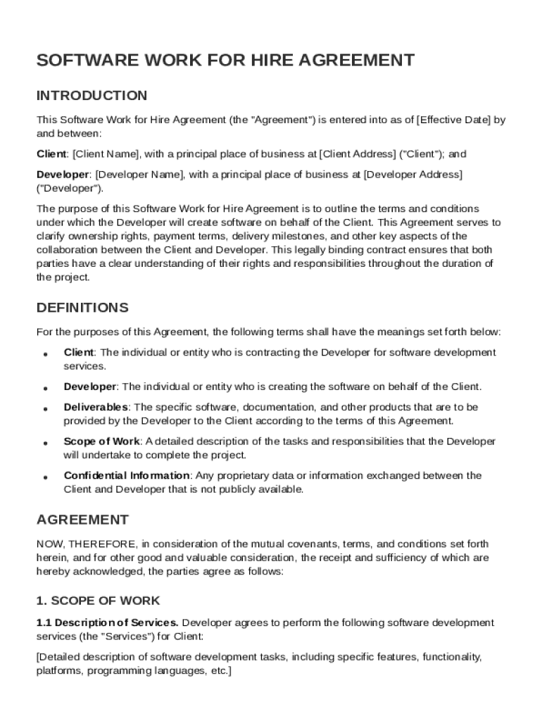 A well-structured Software Work for Hire Agreement covers multiple critical components that ensure both parties have a clear understanding of their responsibilities and rights.