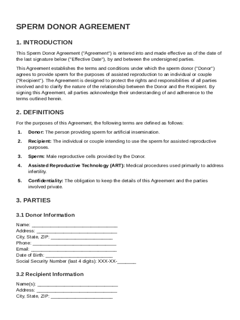 A sperm donor agreement is a formal contract that outlines the rights and responsibilities of both the sperm donor and the recipient. It is crucial to have a standardized document to avoid future disputes and ensure that all parties are aware of their roles. Understanding the legal implications of this agreement is essential, as it protects the interests of both the donor and recipient, clarifying parental rights and obligations.
