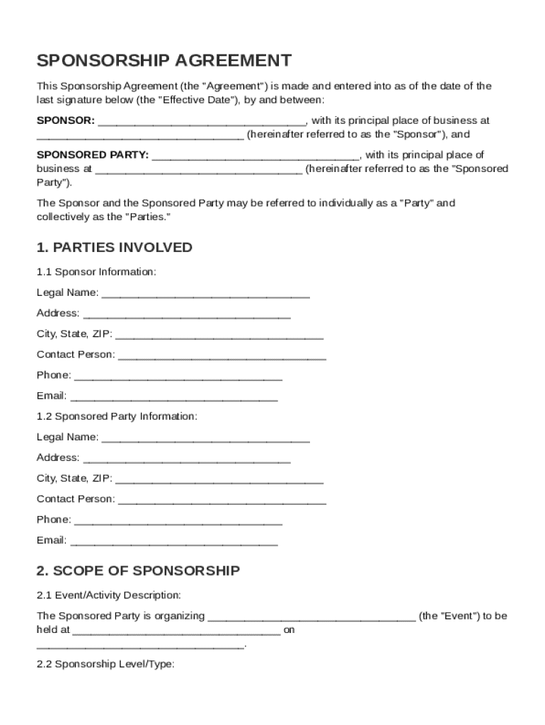 Identifying the parties involved in the sponsorship agreement is crucial for its validation. The two primary parties are the sponsor and the sponsored entity, whose legal names and contact information must be accurately recorded.