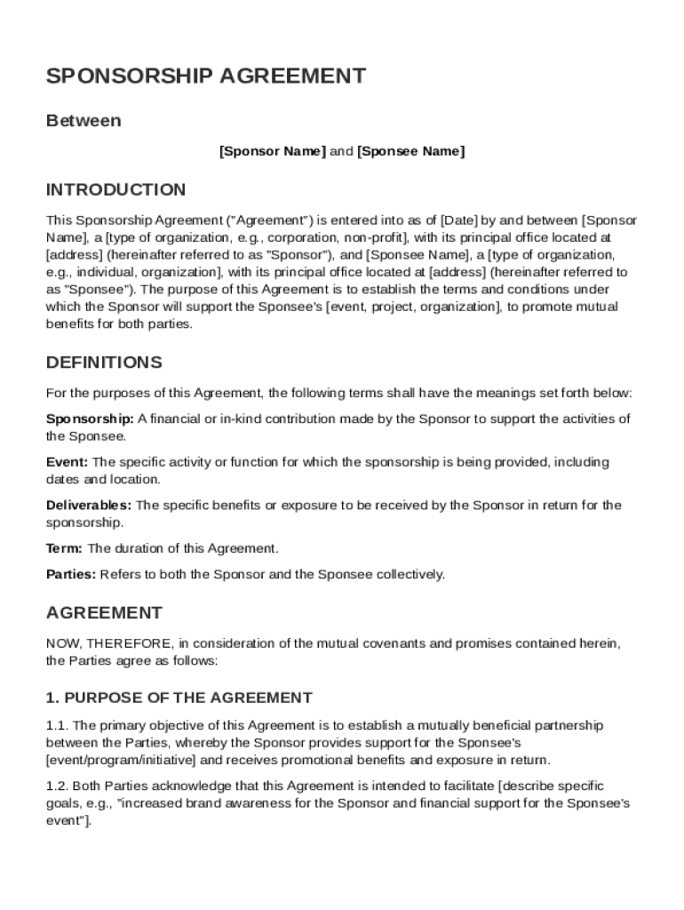 Understanding the key components of a sponsorship agreement is essential for both parties. The agreement typically includes sections detailing the parties involved, the purpose of the agreement, and the scope of sponsorship.