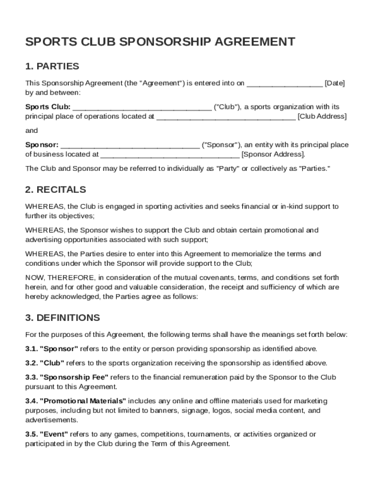 This document serves as a legally binding agreement between a sports club and a sponsor, outlining the terms, conditions, and obligations pertaining to the sponsorship arrangement, including financial