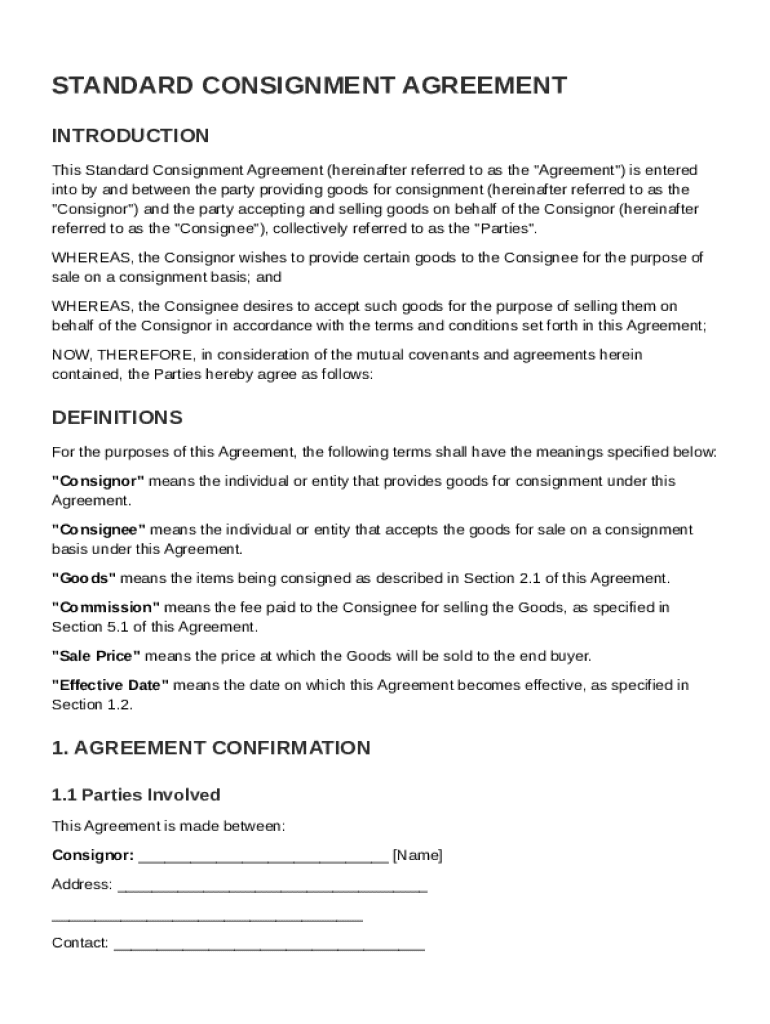 A Standard Consignment Agreement Template is a legal document that outlines the terms and conditions between a consignor and a consignee regarding the sale of goods.