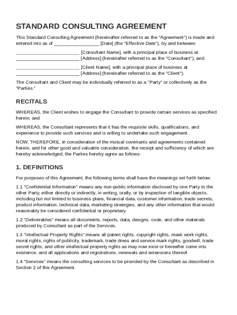 To create a robust Standard Consulting Agreement Template, ensure the following elements are present: