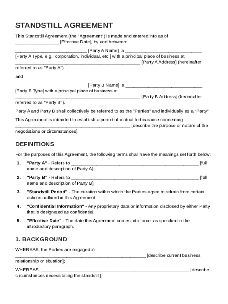 This section covers crucial details related to the Standstill Agreement Template, including its definition, usage, and essential components.
