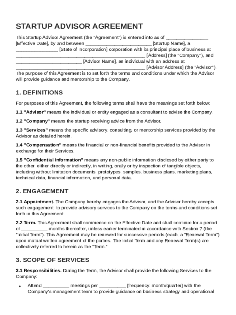 A Startup Advisor Agreement Template is a legal document outlining the terms and conditions of the advisory relationship between a startup company and its advisors.