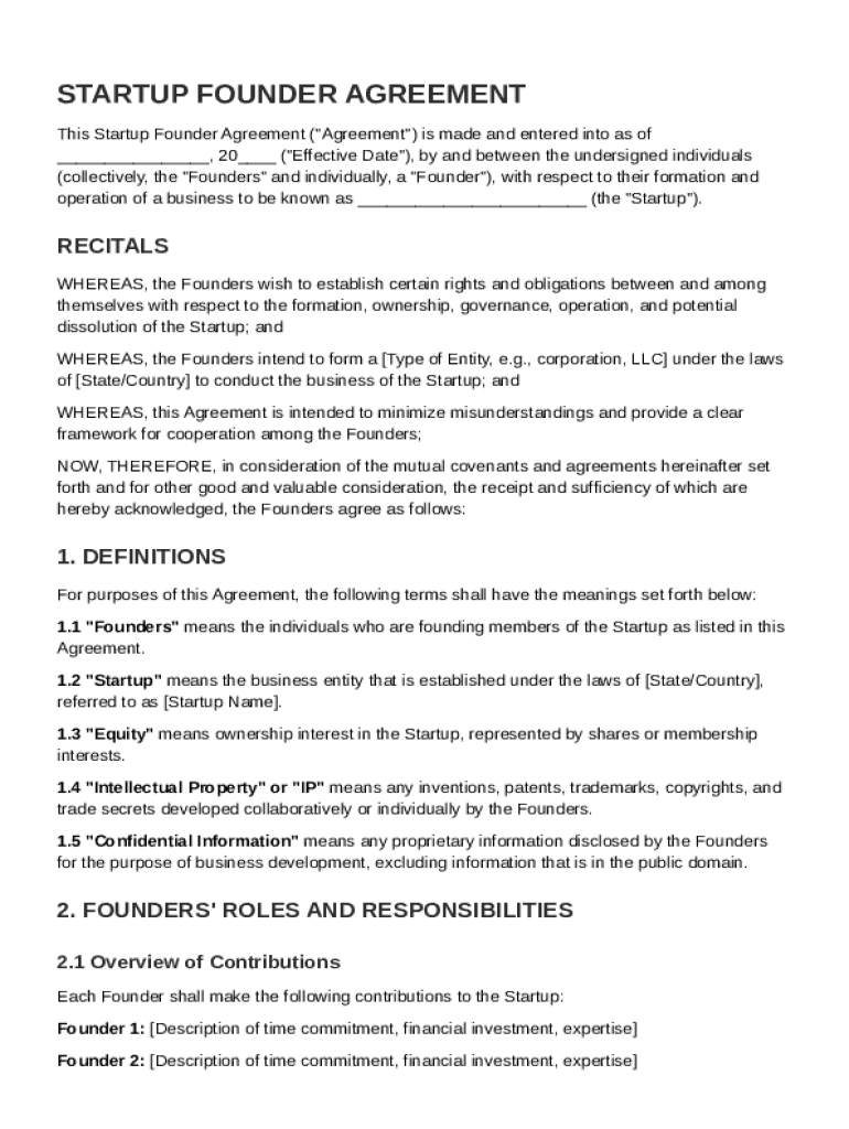 A founder's agreement is a legal document that outlines the roles, responsibilities, and rights of each founder in a startup. This document serves not only to formalize the relationship between founders but also to establish a clear framework for how to manage any disputes or decision-making processes that may arise. Additionally, understanding the significance of such agreements can help prevent misunderstandings and ensure alignment among founders.
