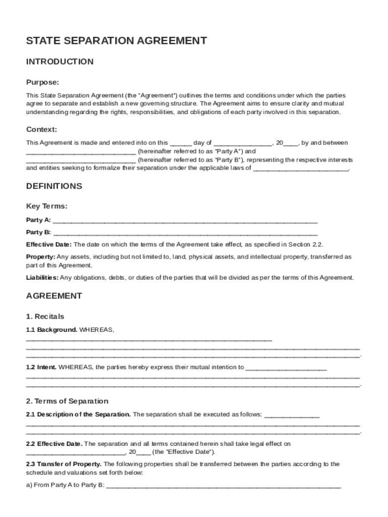 A State Separation Agreement Template is essential for individuals or teams navigating separation. This document outlines the terms and conditions agreed upon by both parties, ensuring clarity and fairness.