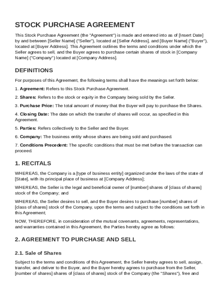 An effective Stock Purchase Agreement contains several key components that clarify the terms of the sale. Each of these components plays a significant role in the transaction and helps to protect both parties.