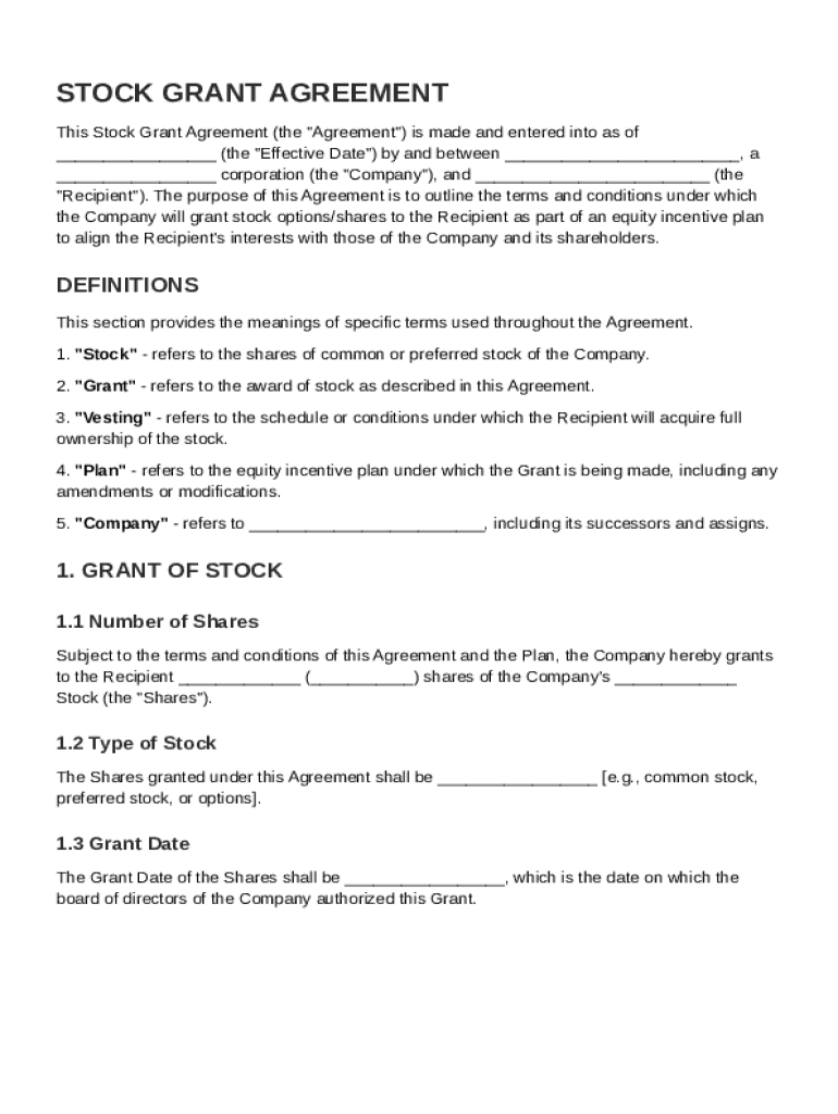 A Stock Grant Agreement Template is a legal document that outlines the terms and conditions under which an employee is granted stock options or shares by their employer. This agreement typically delineates the rights and obligations of both the employer and the employee regarding stock ownership and transfer.