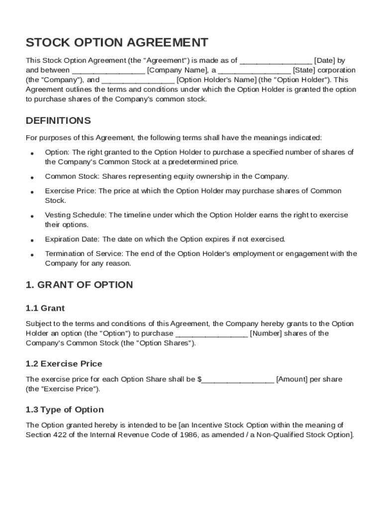 This document is a Stock Option Agreement that outlines the terms and conditions under which an Option Holder is granted the option to purchase shares of a company\'s common stock.