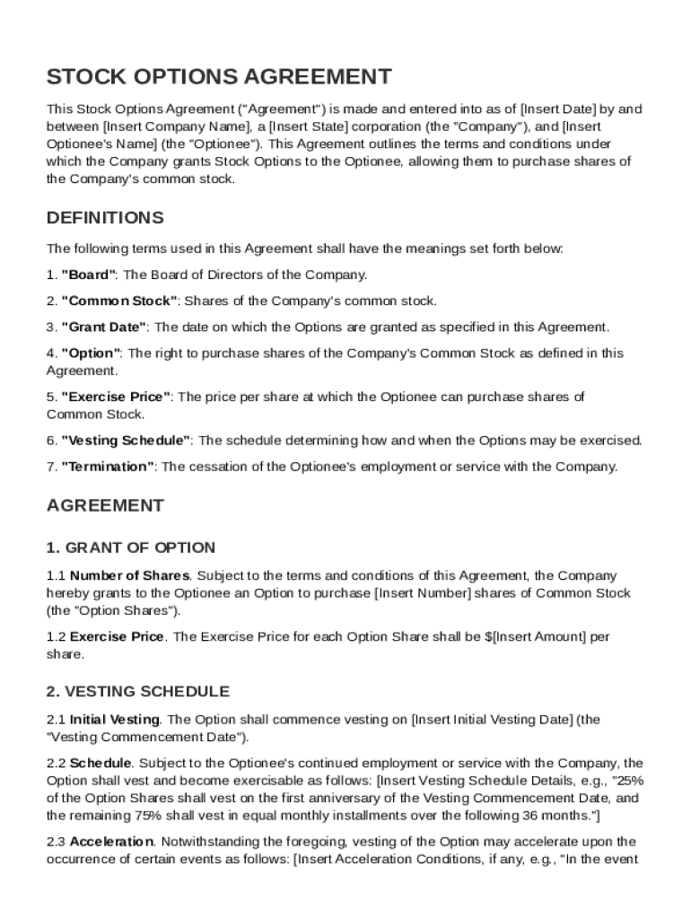 A Stock Options Agreement Template is a legal document that outlines the terms under which stock options are granted to employees or investors.