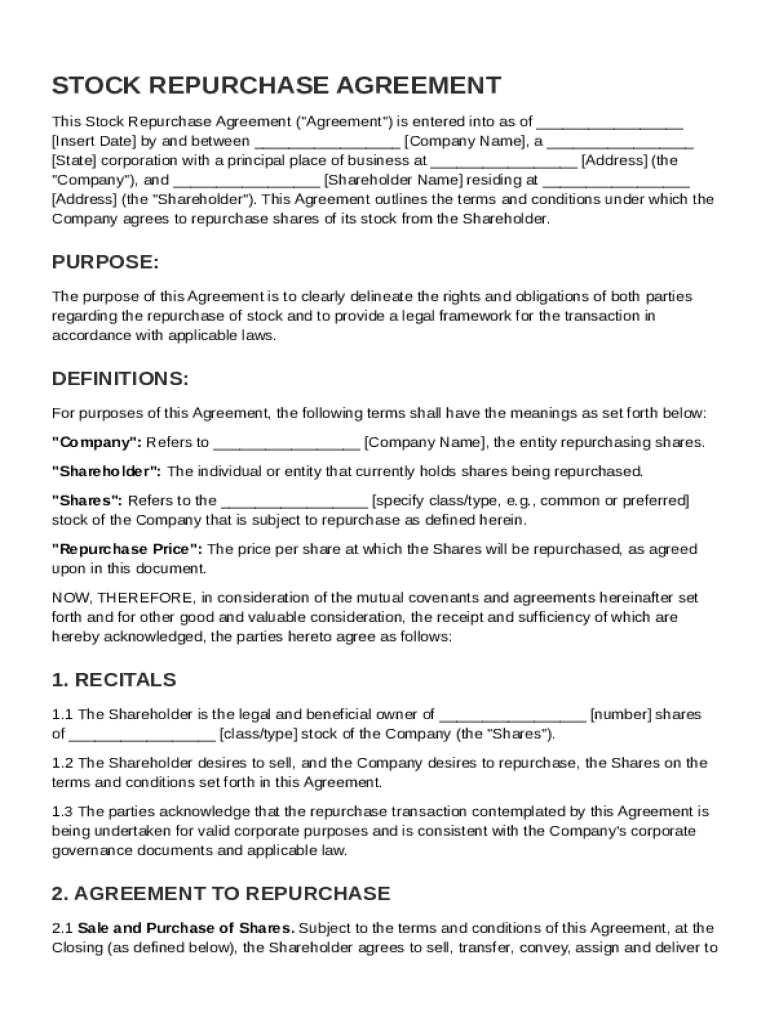 A Stock Repurchase Agreement (SRA) essentially outlines the conditions under which a company can buy back its shares from shareholders. This agreement serves multiple purposes, including boosting shareholder value and allowing corporations to adjust their equity structure. In this section, we will delve into the definition and significance of SRAs in corporate governance.