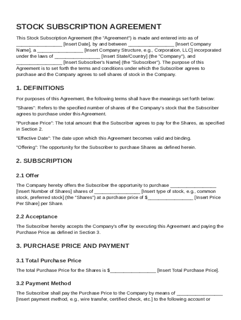The primary sections included in a Stock Subscription Agreement generally cover: