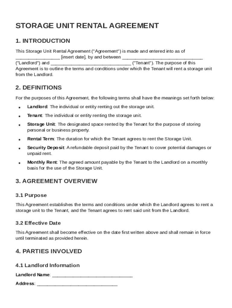 A storage unit rental agreement is a formal document that outlines the terms and conditions between a landlord (storage facility owner) and a tenant renting storage space. This agreement is significant because it clarifies responsibilities and expectations on both sides.