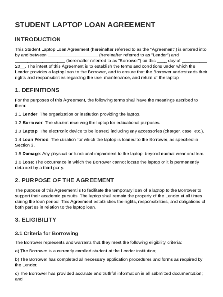 A Student Laptop Loan Agreement Template is a legal document outlining the terms and conditions under which a student borrows a laptop from an educational institution.