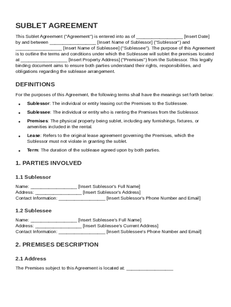A Sublet Agreement Template is a legal document that outlines the terms and conditions under which a tenant can rent out their leased premises to another individual.
