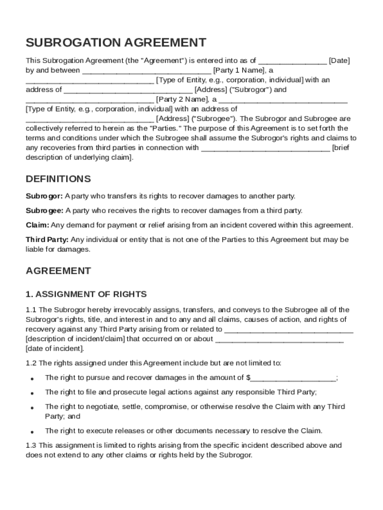 A subrogation agreement is a legal document that allows one party (the Subrogee) to step into the shoes of another party (the Subrogor) to claim rights to recover losses from a third party. This process is especially crucial in contexts where insurance claims are involved, as it enables insurers to pursue the responsible party after paying out a claim. Understanding this agreement can greatly impact financial recovery for both individuals and companies.