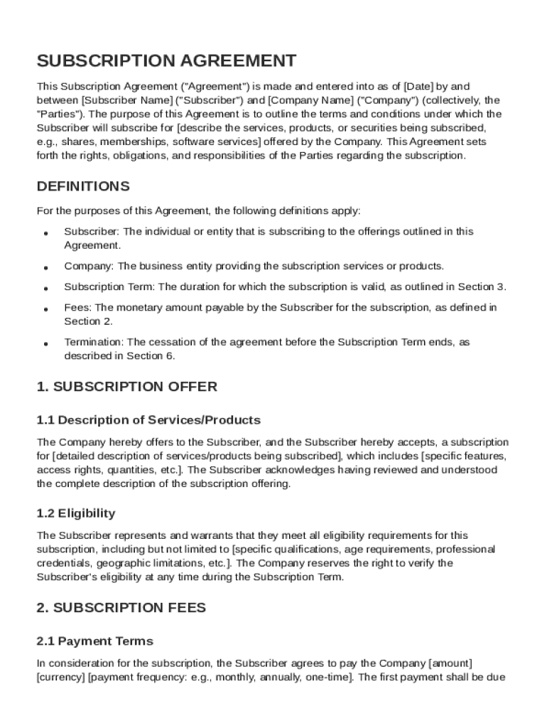 A Subscription Subscription Agreement Template is a standardized document that outlines the terms and conditions of a subscription service between a provider and a subscriber.