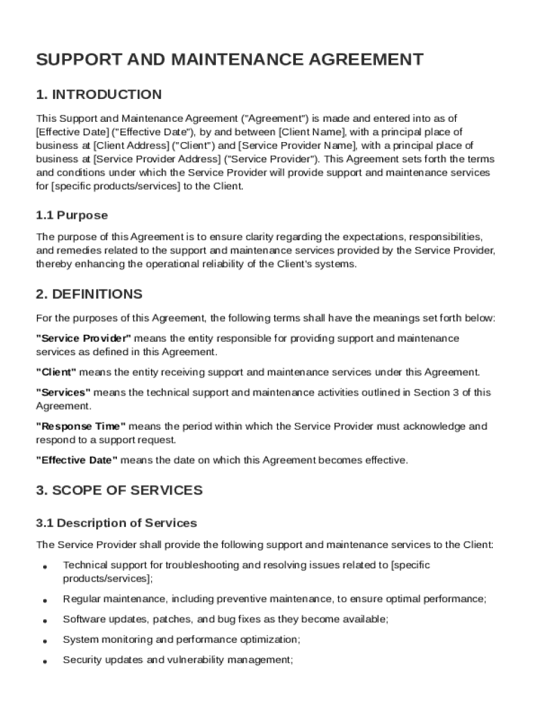This document outlines the terms and conditions under which a Service Provider will deliver support and maintenance services to a Client, detailing the scope of services, responsibilities, compensation,