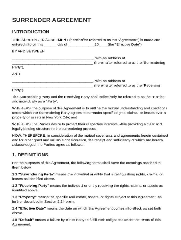 A Surrender Agreement is a legal document that formalizes the terms under which a party relinquishes their lease or rental rights to a property. In New York City, this document is crucial for ensuring that both parties understand their rights and obligations upon the termination of a lease.