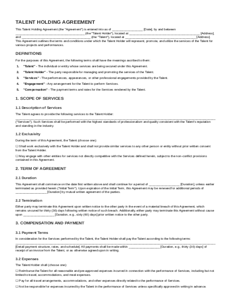 A Talent Holding Agreement Template is a legal document used to outline the terms and conditions under which a talent agency or manager retains exclusive rights to represent a performer or artist.