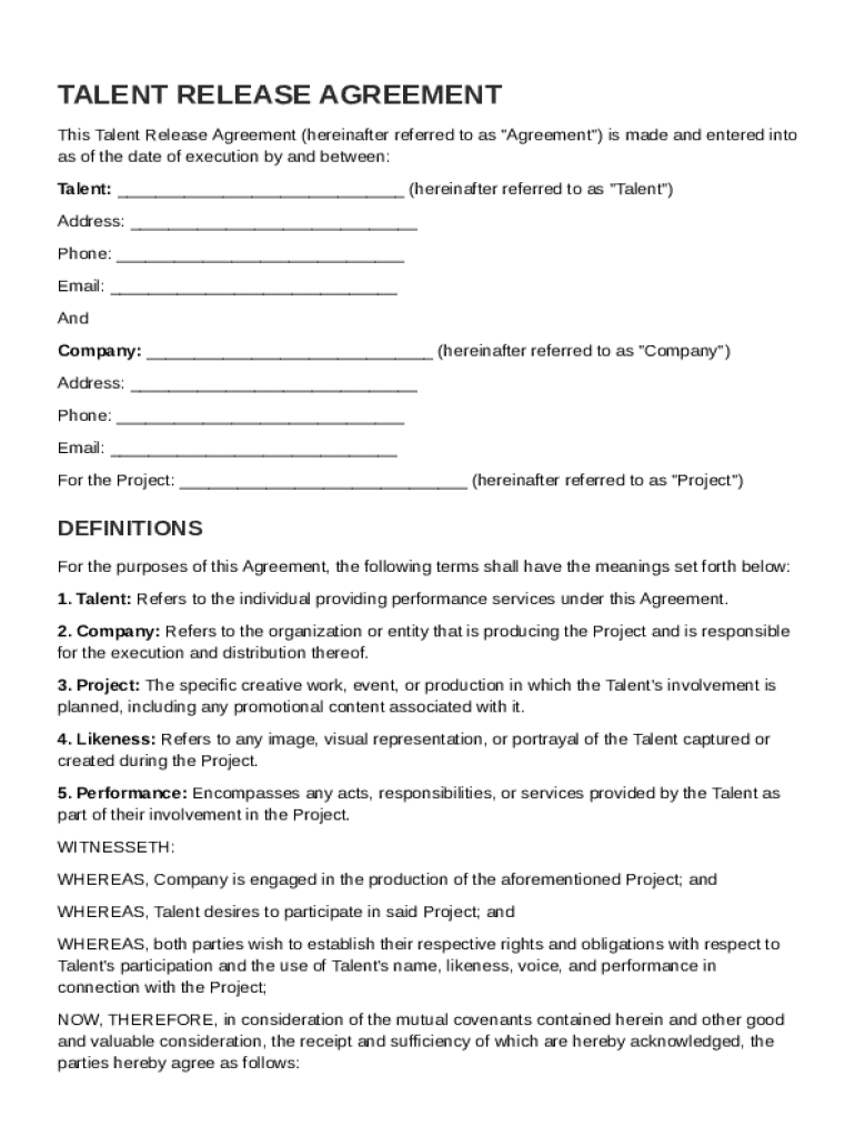 Understanding the formal elements of a Talent Release Agreement ensures clarity and protection for all involved. This document typically features several critical components that define the scope and nature of the agreement.