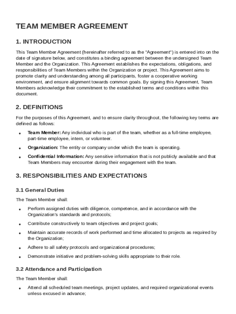 A Team Member Agreement Template is a formal document outlining the roles, responsibilities, and expectations of team members within a project or organization.
