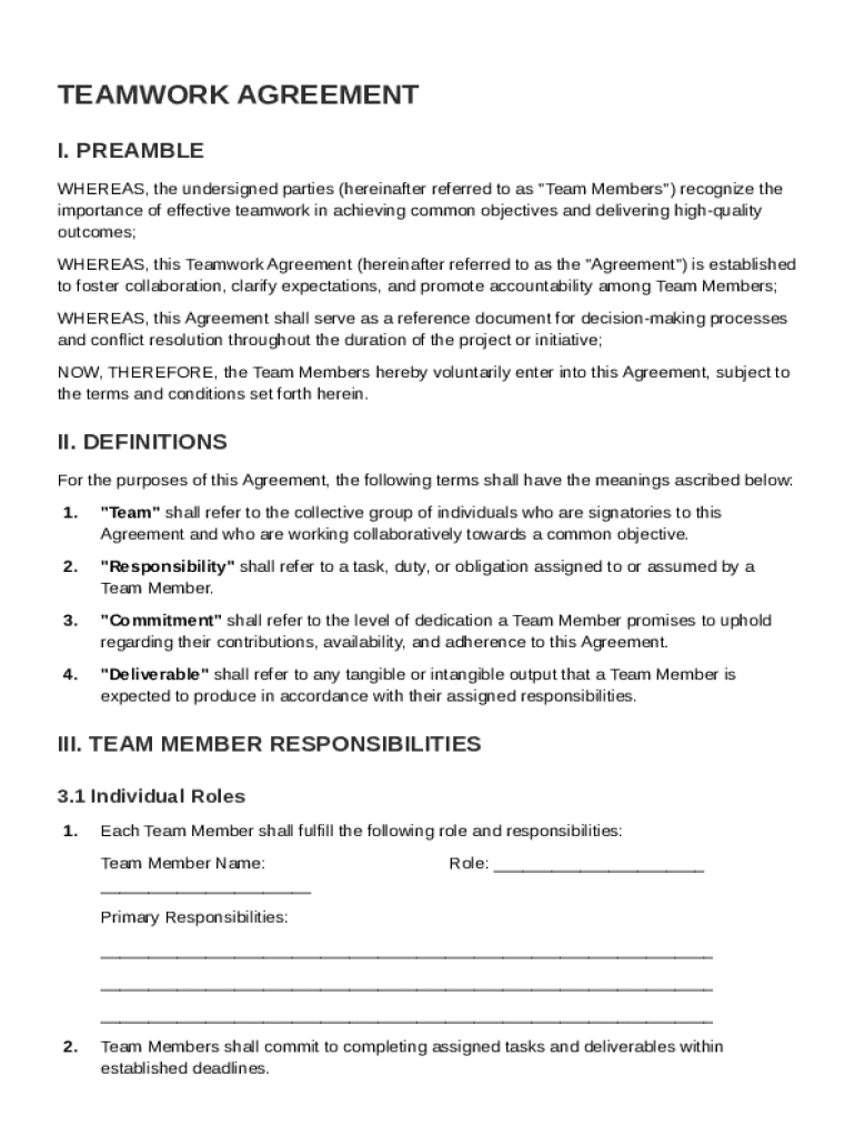 A Teamwork Agreement Template is a structured document designed to facilitate collaboration and define roles, responsibilities, and expectations among team members.