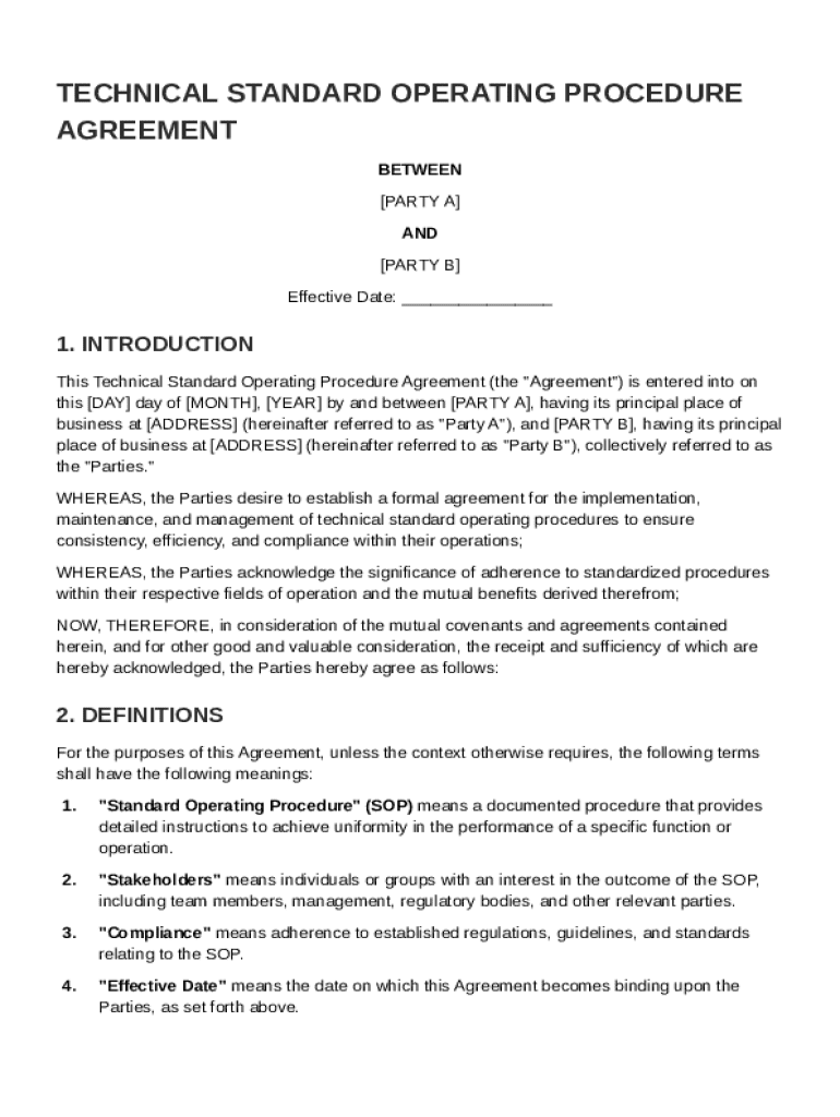 A Technical Standard Operating Procedure (SOP) Agreement defines operational policies and procedures to streamline tasks and ensure compliance. Such agreements are crucial as they specify roles, responsibilities, and expectations within an organization. By implementing technical SOPs, businesses can foster consistency and efficiency.