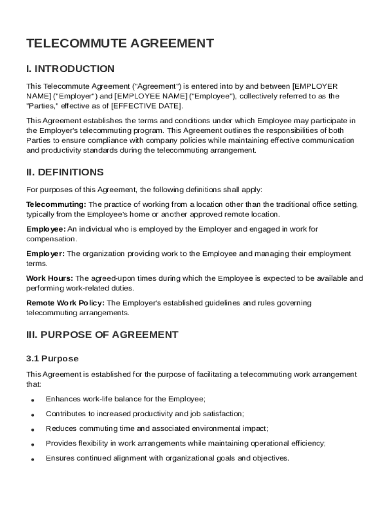 This document outlines the terms and conditions for a telecommuting arrangement between the Employer and Employee, detailing responsibilities, eligibility, and guidelines for effective remote work.