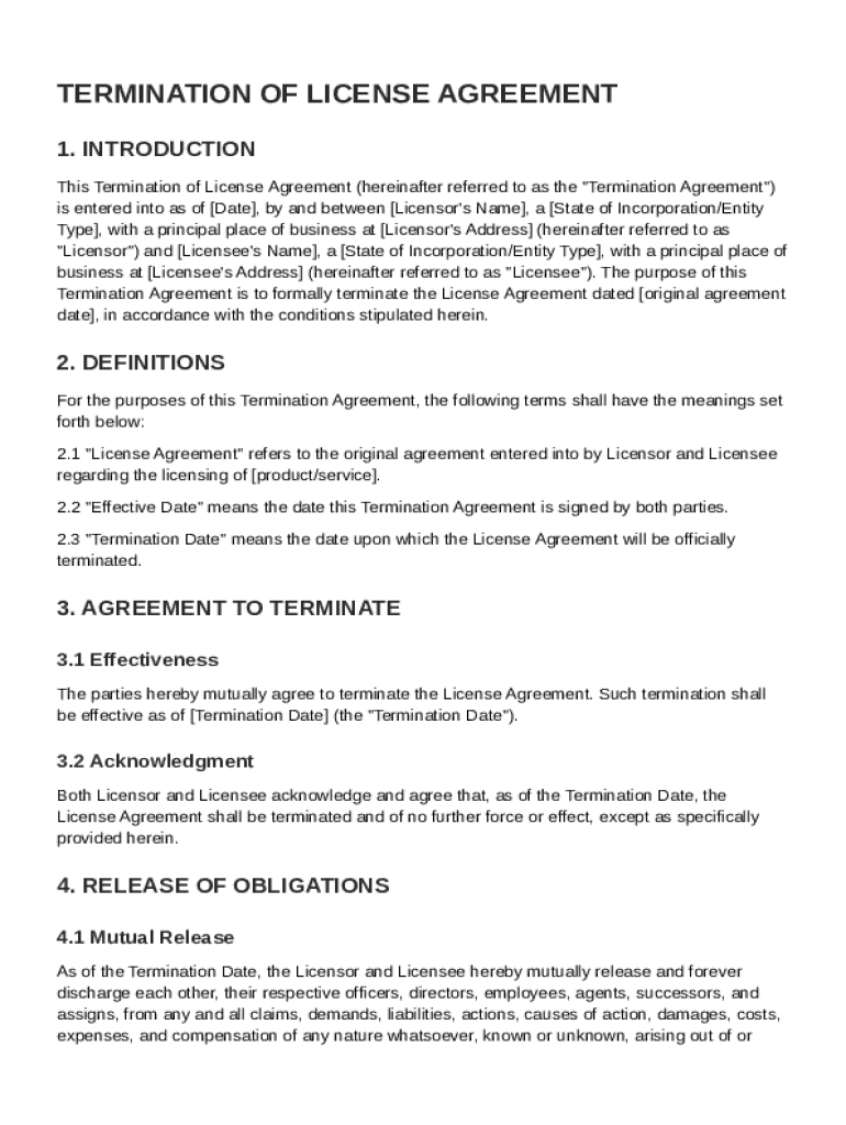 A termination of license agreement is a formal document that outlines the end of a licensing relationship between a licensor (the party granting the license) and a licensee (the party receiving the license). Understanding the definition of such agreements and the potential grounds for termination is crucial for both parties. Common grounds include breach of contract, mutual consent, or failure to meet specific obligations.
