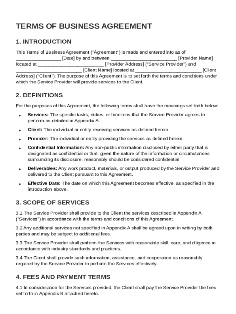 A Terms of Business Agreement is a contract that outlines the terms and conditions between service providers and clients. It is crucial for both parties to ensure clear expectations and legal footing in business transactions. In essence, these agreements help in establishing a solid foundation for service delivery and protecting the rights of all involved.