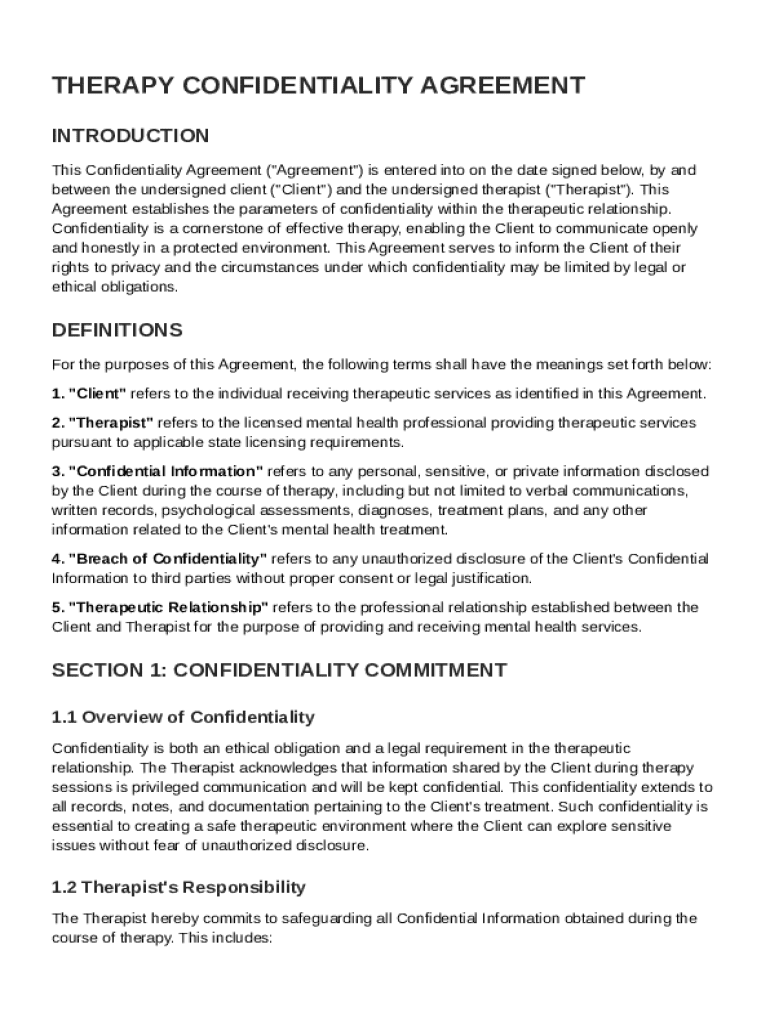 This Confidentiality Agreement outlines the rights of the Client and the responsibilities of the Therapist regarding confidentiality within the therapeutic relationship, detailing the circumstances