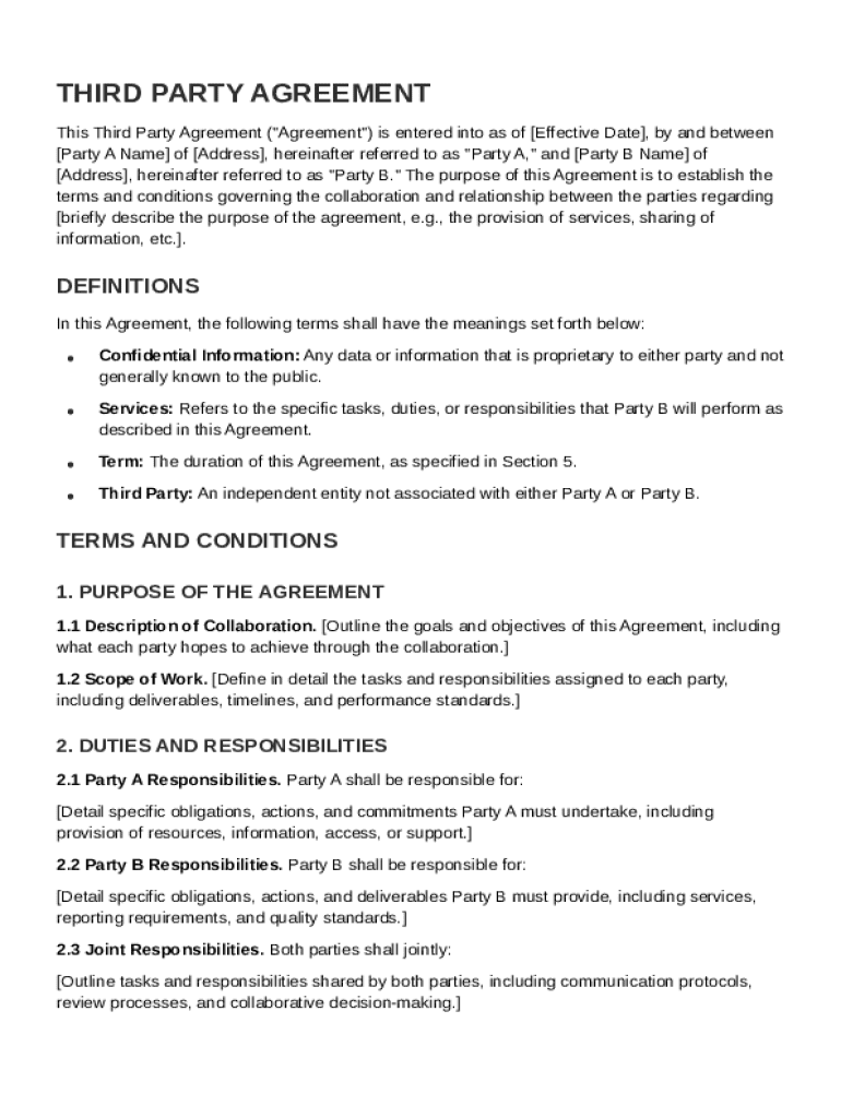 When drafting a Third Party Agreement Template, it's crucial to include several essential components to ensure clarity and enforceability. Each section helps define the scope of the agreement, including the identification of parties involved, the purpose, and the terms surrounding the collaboration.