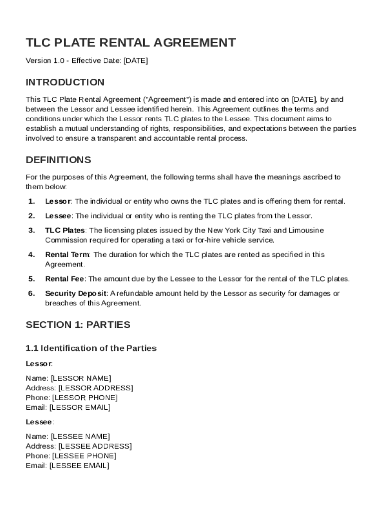 The Tlc Plate Rental Agreement Template should incorporate the following sections: