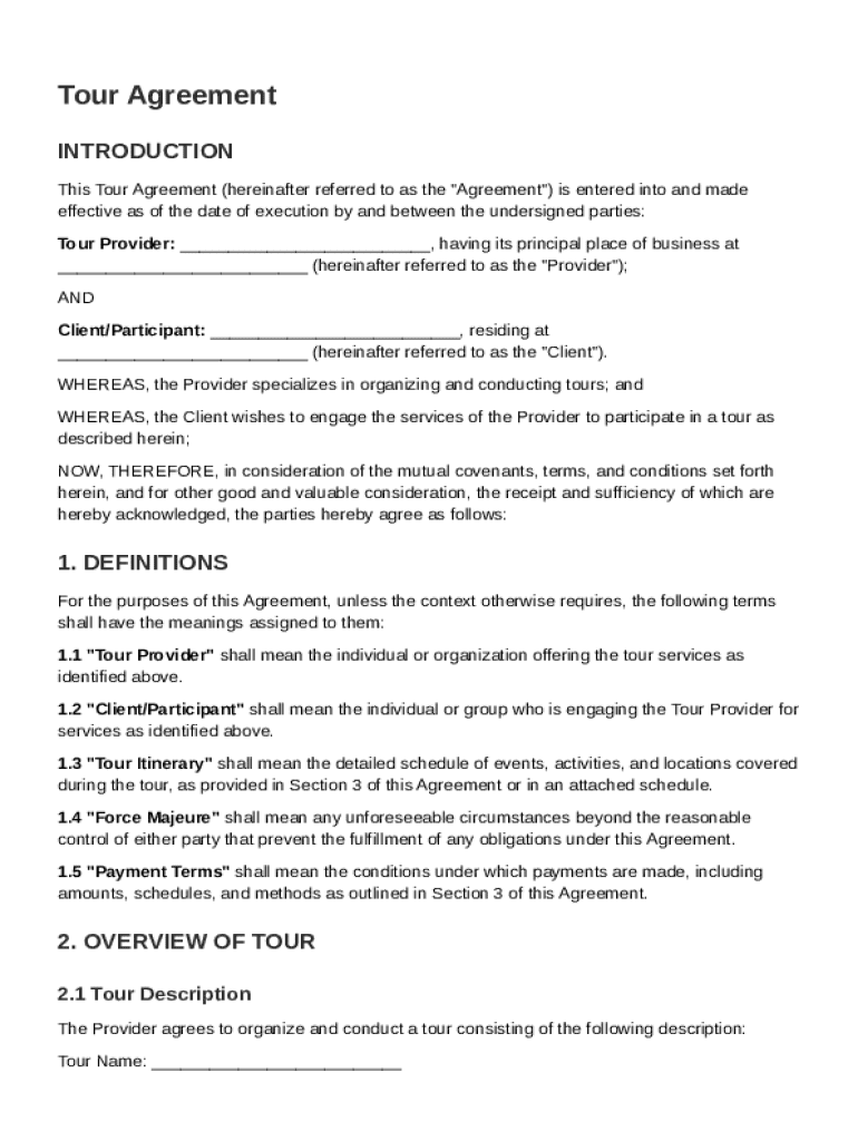 A Tour Agreement is a legally binding document outlining the terms and conditions agreed upon by the service provider and the client. This agreement serves to protect both parties, ensuring clarity regarding expectations, responsibilities, and legal obligations.