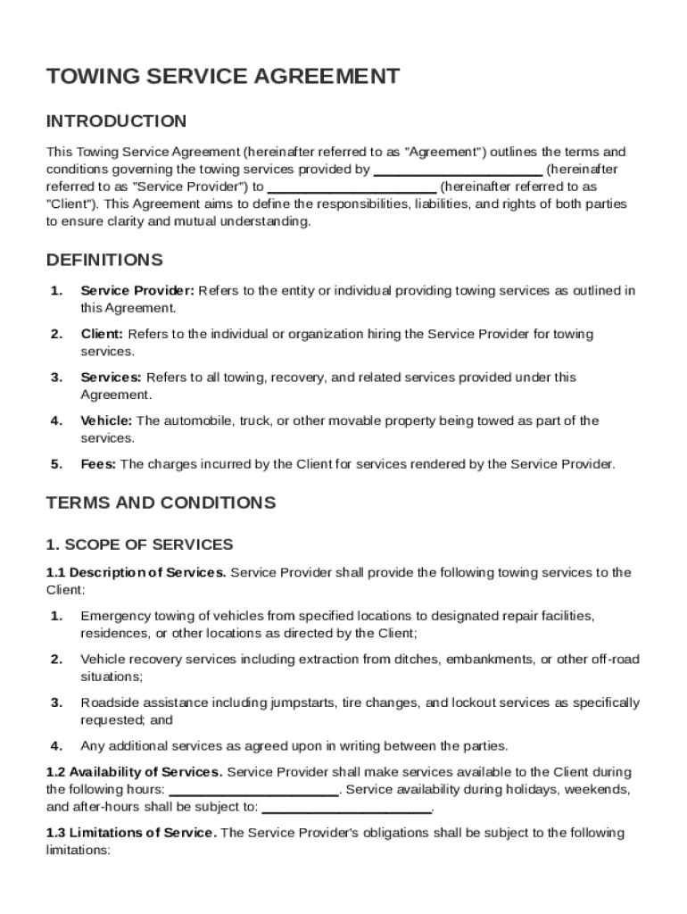 This document outlines the terms and conditions governing the towing services provided by a Service Provider to a Client, defining responsibilities, liabilities, and rights of both parties.
