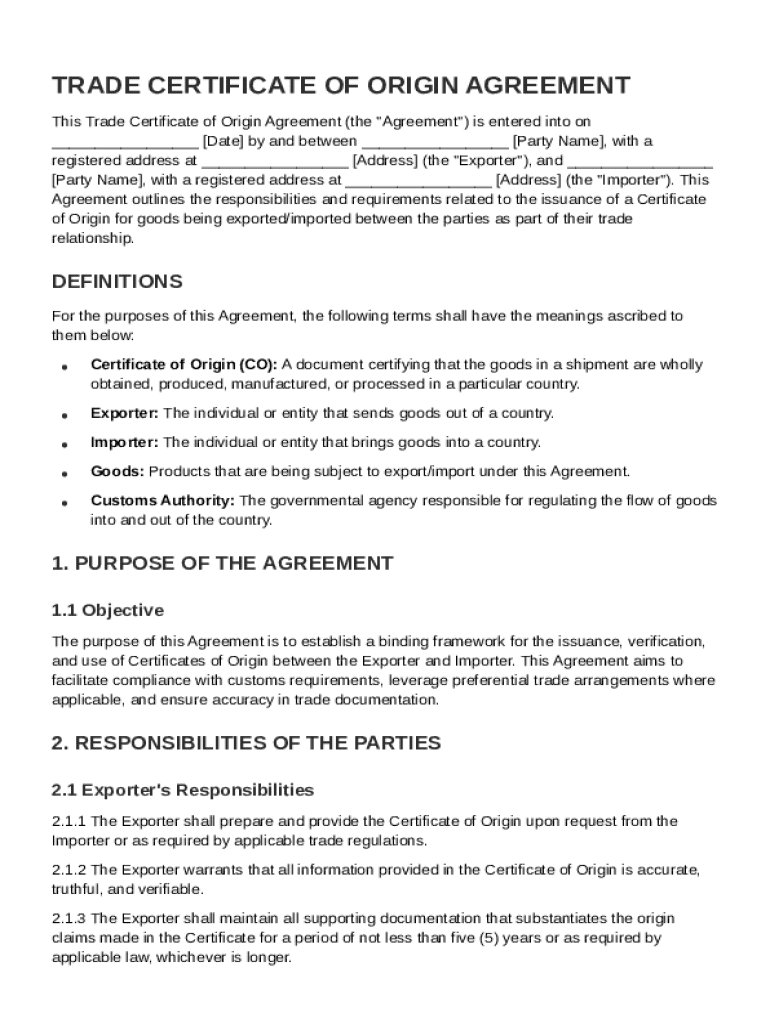 This section will provide comprehensive details about the Trade Certificate of Origin Agreement Template, including its definition and relevant provisions.