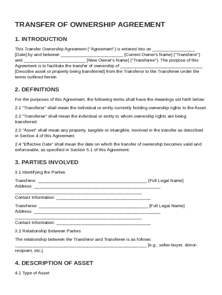 A comprehensive Transfer Ownership Agreement generally consists of several main sections, including: