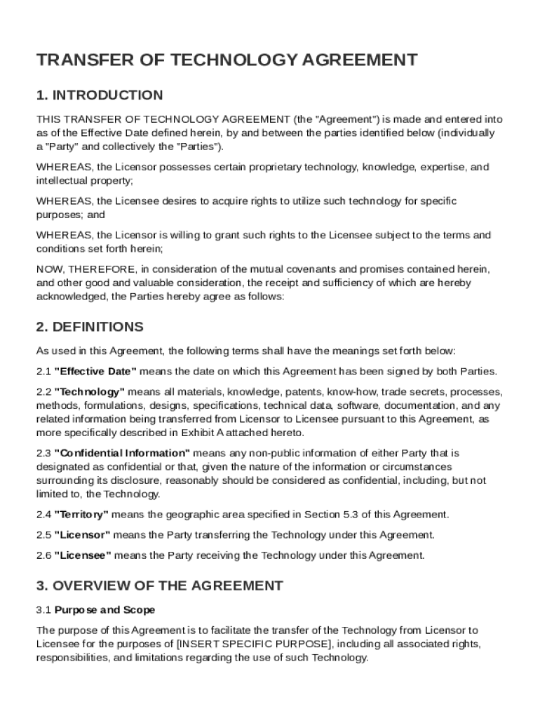 A Transfer of Technology Agreement Template is a legal document that outlines the terms and conditions under which technological knowledge, processes, or innovations are shared between parties.