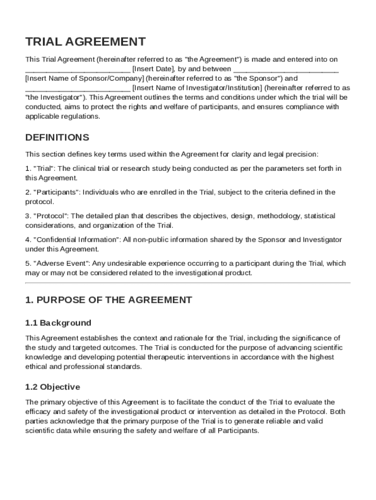 Trial agreements are pivotal in ensuring that all parties understand their roles and responsibilities. They facilitate smooth communication, promote ethical standards, and mitigate conflicts that may arise during the trial. A well-drafted agreement can also aid in compliance with regulatory requirements, thereby enhancing the trial's credibility.
