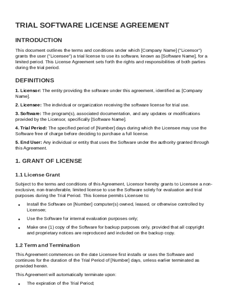 A Trial Software License Agreement defines the terms under which a user can test software before making a commitment to purchase. Understanding this agreement is crucial for both businesses and individuals wishing to evaluate software functionality effectively.