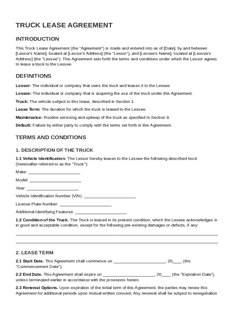 This document outlines the terms and conditions under which a truck is leased from a lessor to a lessee, including details on payment, responsibilities, and maintenance.