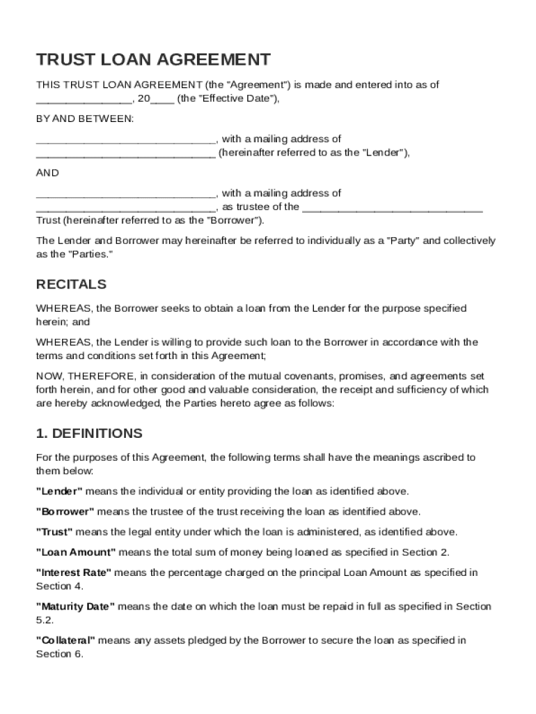 A Trust Loan Agreement Template is a legal document that outlines the terms of a loan made from a trust to a borrower.