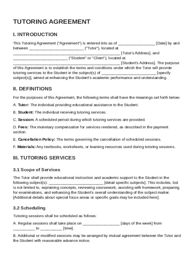 A Tutoring Agreement Template is a formal document that outlines the terms and conditions of a tutoring arrangement between a tutor and a student or parent.