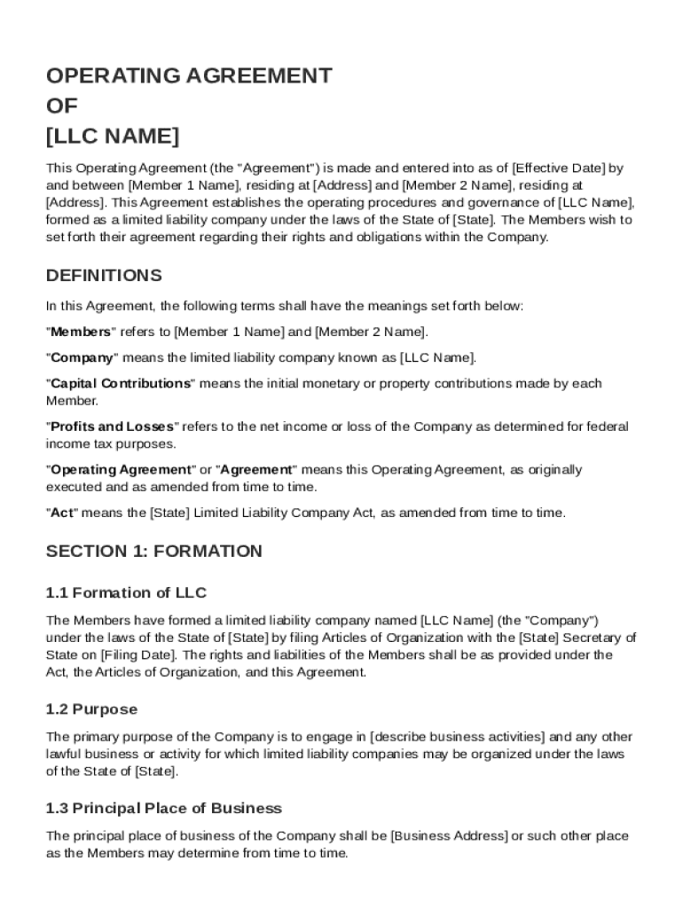 This document outlines the operating procedures, governance, and agreements between members of a limited liability company (LLC). It includes definitions, formation details, membership information,