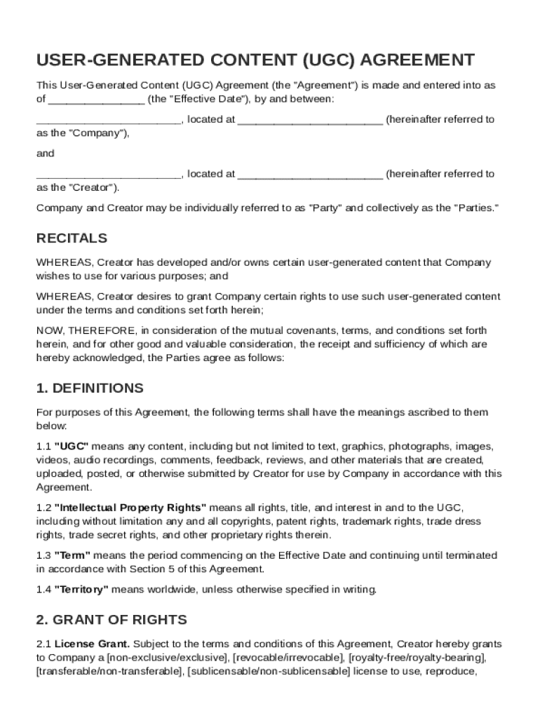 The UGC Agreement Template is a legal document that sets forth the terms and conditions under which user-generated content (UGC) can be used by a brand or organization.