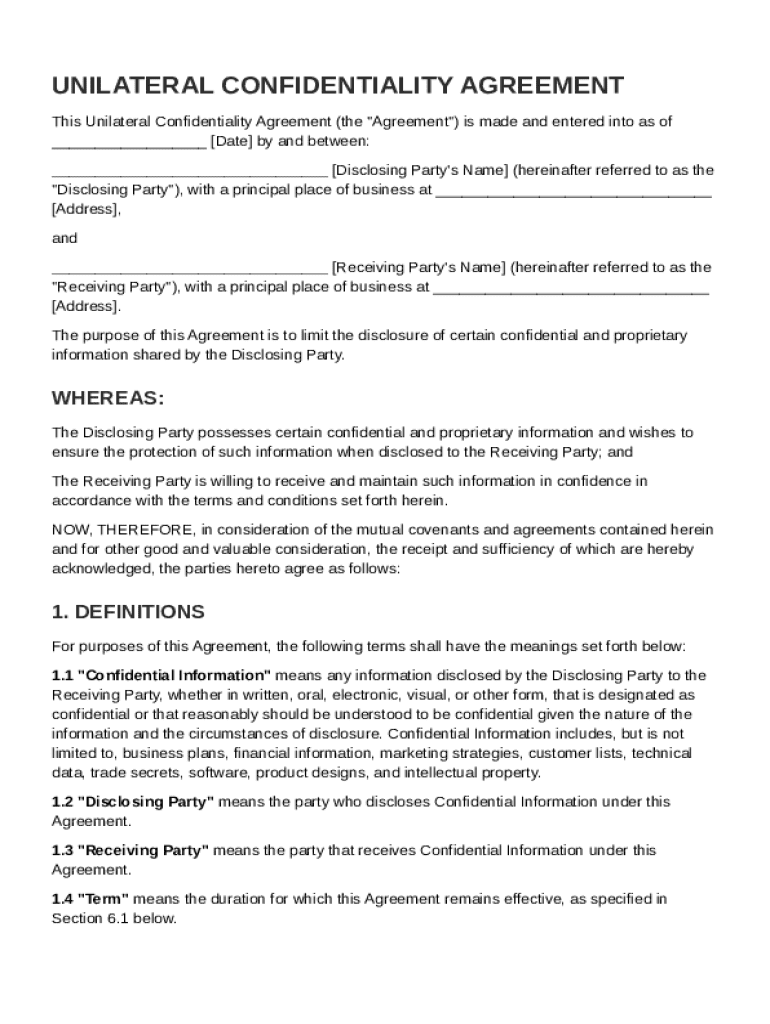 A Unilateral Confidentiality Agreement Template is a legal document that allows one party to protect its sensitive information from being disclosed by another party.