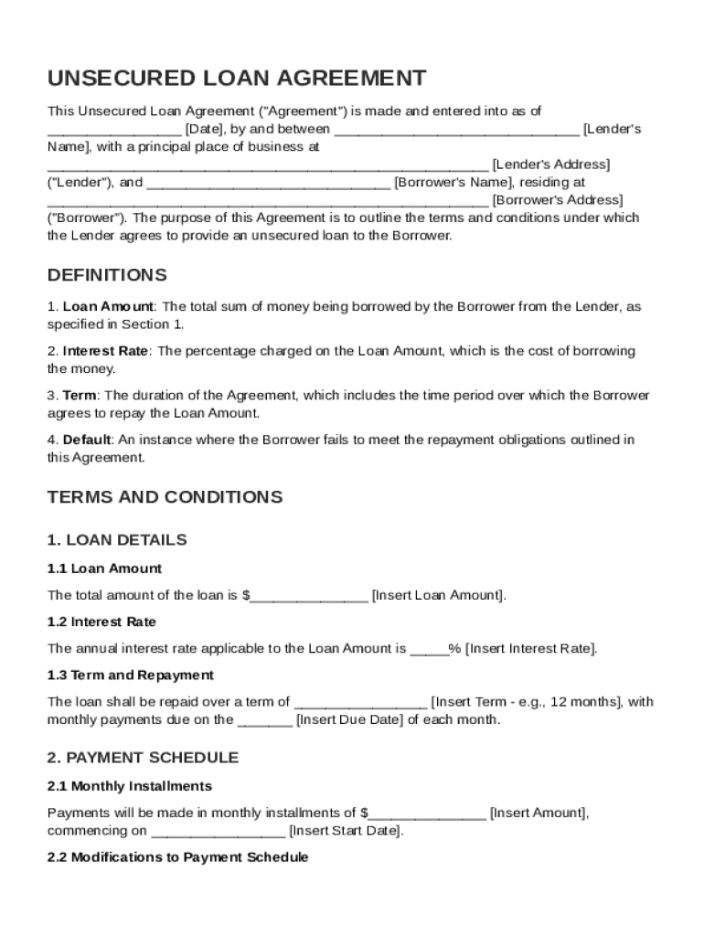 This document outlines the terms and conditions under which an unsecured loan is provided by a lender to a borrower.